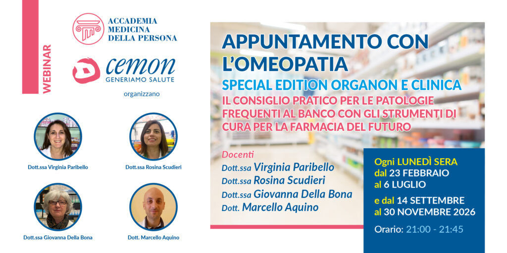 WEBINAR – APPUNTAMENTO CON L’OMEOPATIA – SPECIAL EDITION ORGANON E CLINICA – Dr.i AQUINO – DELLA BONA – PARIBELLO – SCUDIERI