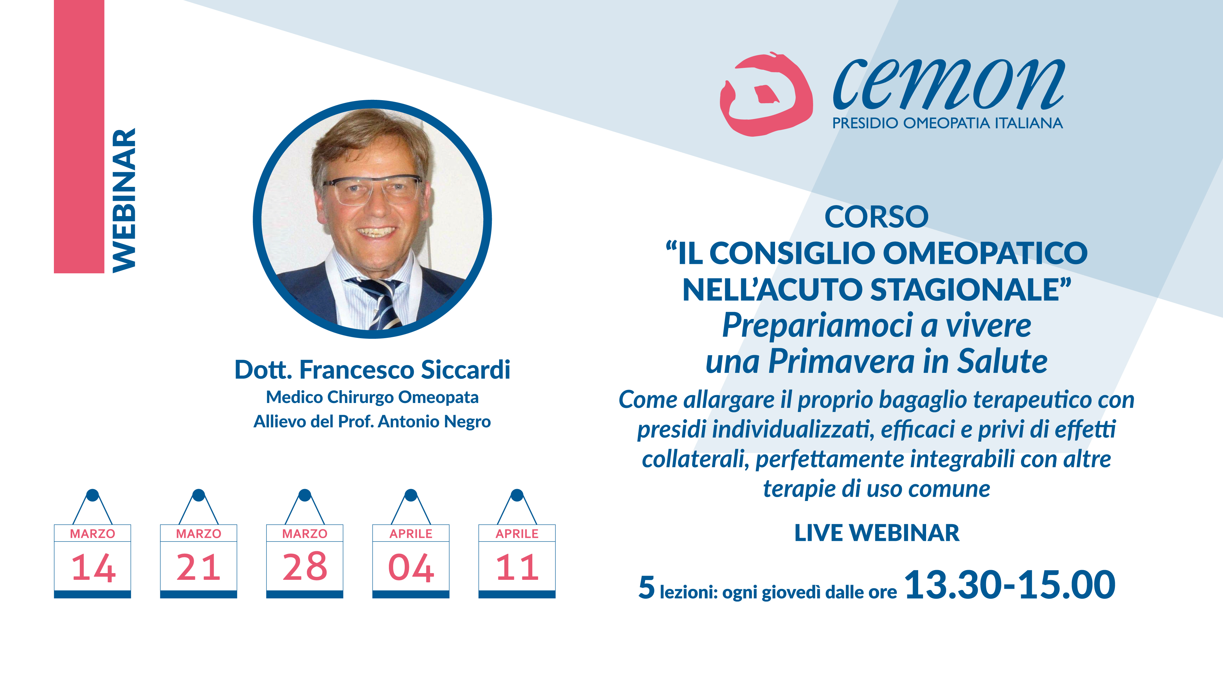 Questi webinar formativi sulla medicina omeopatica nascono dall’esigenza di fornire quelle nozioni atte a comprendere non solo la sintomatologia fisica ma il perché dell’instaurarsi del quadro morboso e come trattarlo al fine di migliorare e restaurare l’equilibrio generale del paziente. Sono inoltre di ausilio per poter integrare i rimedi della medicina complementare con la terapia farmacologica, apportando miglioramento degli eventuali effetti collaterali e, qualora la clinica lo permetta, poter pensare di far diventare i rimedi omeopatici e bioterapici, la scelta terapeutica di elezione, in quanto sempre più i pazienti chiedono cure a basso grado di invasività.