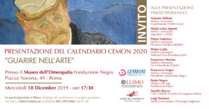 PRESENTAZIONE DEL CALENDARIO CEMON 2020 "GUARIRE NELL'ARTE" Mercoledì 18 Dicembre 2019 ore 17:30 ROMA Piazza Navona, 49 Presso il Museo dell'Omeopatia Fondazione Negro La partecipazione è libera. Si prega di confermare la propria presenza via mail a info@cemon.eu o telefono 081-395188 (ore 9-14)