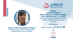 Ulteriori informazioni »ONLINE – CORSO “CONSIGLI PRATICI PER VIVERE UN INVERNO SERENO CON I NOSTRI AMICI A 4 ZAMPE” LIVE WEBINAR – Dott.ssa M. Desiderata D’Angelo