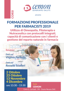 FORMAZIONE PROFESSIONALE PER FARMACISTI 2019. Utilizzo di Omeopatia, Fitoterapia e Nutraceutica con protocolli integrati, capacità di comunicazione con i clienti e gestione del reparto naturale in farmacia. LA PARTECIPAZIONE ALLA FORMAZIONE E’ GRATUITA GRUMO NEVANO (NA) presso la sede degli uffici del Cemon in Corso G. Garibaldi, 198 Questo corso nasce dall’esigenza di fornire le nozioni fondamentali per un inquadramento dei problemi di salute per i quali viene più spesso richiesto il consiglio professionale del farmacista. L’approccio proposto è individualizzato…