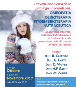 Seminari Prevenzione e cura delle patologie invernali con OMEOPATIA OLIGOTERAPIA FITOEMBRIOTERAPIA NUTRACEUTICA Sedi varie : BRESCIA-BOLOGNA-FIRENZE-MILANO-UDINE-VICENZA Per scaricare il depliant con tutte le serate clicca qui Obiettivi del corso Il trattamento e la cura delle patologie della stagione fredda, acute e croniche, risultano molto efficaci con l’uso intelligente e integrato di Omeopatia, Fitoembrioterapia e Oligoterapia. Ciascuna di queste metodiche terapeutiche, agendo ognuna su un proprio piano peculiare, collabora sinergicamente a rimuovere blocchi energetici, fisiologici e metabolici,…
