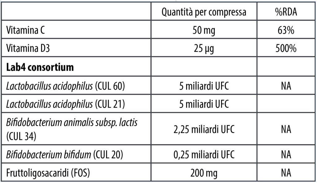 INGREDIENTI: Edulcorante (xilitolo), Lactobacillus acidophilus CUL 60 e CUL 21, Bifidobacterium animalis subsp. lactis CUL 34, Bifidobacterium bifidum CUL 20, Frutto-oligosaccaridi, aromi naturali (fragola, vaniglia), Antiagglomeranti (biossido di silicio, magnesio stearato), Vitamina C (acido ascorbico), Vitamina D3 (colecalciferolo), Carbossimetilcellulosa sodica, Idrossipropilmetilcellulosa, Gomma d’acacia, Saccarosio.